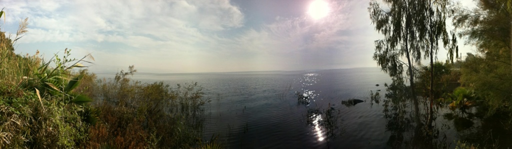 When we were there it was like a mill pond, as you can see. You can just about see Syria on the horizon, only something like 7.5 miles away! (The Sea of Galilee is about 8 miles wide and 13 long, or approx 13 x 21 km).